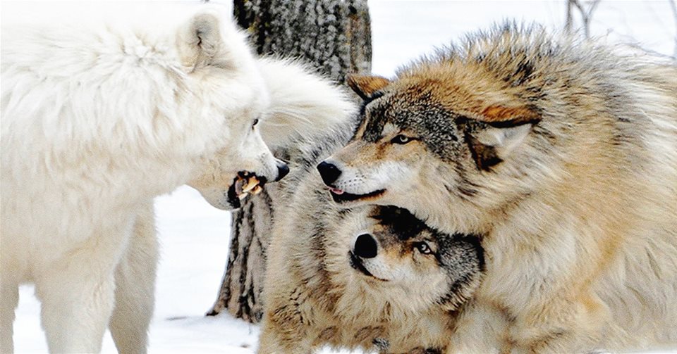 Μια λύκαινα κρύβεται κάτω από έναν αρσενικό λύκο. Εκείνη δεν φοβάται τον αντίπαλό του αλλά αυτό συμβαίνει μόνο γιατί έχει εμπιστοσύνη στο σύντροφό της και πιστεύει στην δύναμή του. Οι αρσενικοί λύκοι δεν επιτίθενται ποτέ σε ένα θηλυκό, και το ξέρει. Γιατί κρύβεται τότε; Με αυτή την κίνηση, το πολυμήχανο θηλυκό προστατεύει τον λαιμό του συντρόφου της ενάντια σε μια επίθεση.