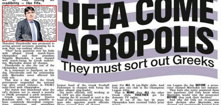 Άρθρο της Sun «λούζει» το ελληνικό ποδόσφαιρο με χαρακτηρισμούς όπως παντελώς αναξιόπιστο, διεφθαρμένο και αχίλλειο πτέρνα της UEFA. Το αγγλικό δημοσίευμα εκφράζει απορίες για το πού καταλήγουν (μέσω της ευρωπαϊκής ομοσπονδίας) τα λεφτά που χρυσοπληρώνουν οι Βρετανοί για το Champions League και αφήνει αιχμές για τις σχέσεις του Βαγγέλη Μαρινάκη με το νέο επικεφαλής της UEFA, Θόδωρο Θεοδωρίδη.