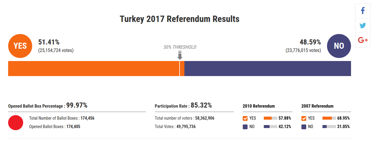 Με μόλις 51,41 % έναντι 48,59% πέρασε η αναθεώρηση του Συντάγματος για τη διεύρυνση των εξουσιών του επόμενου Προέδρου της Τουρκίας, ο οποίος θα εκλεγεί στις 3 Νοεμβρίου του 2019 και με καταμετρημένο το 99,97% των ψήφων.