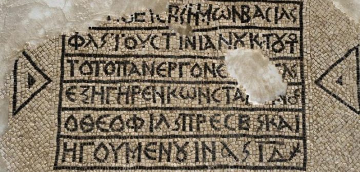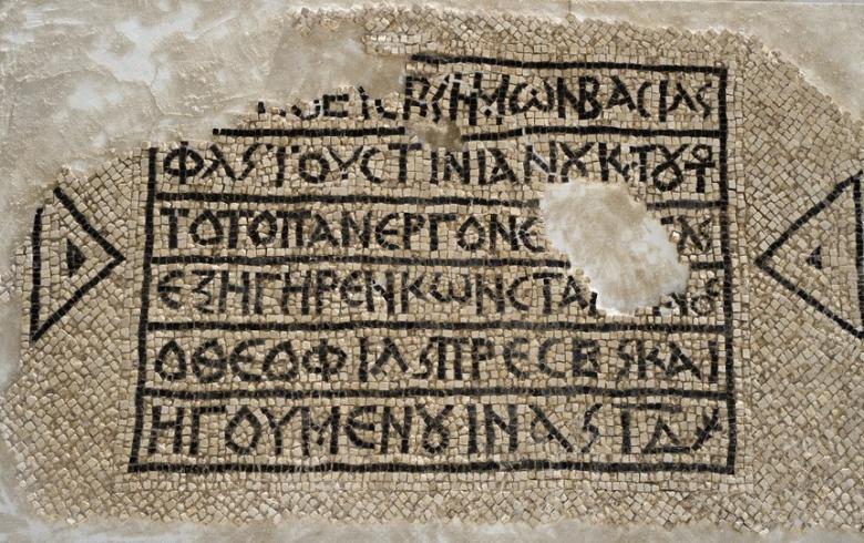 Η πλήρης επιγραφή αναφέρει: «Ο πιο ευσεβής Ρωμαίος αυτοκράτορας Φλάβιος Ιουστινιανός και ο πιο θεοσεβής ιερέας και ηγούμενος, Κωνσταντίνος, ανήγειραν το κτήριο στο οποίο (αυτό το μωσαϊκό) τοποθετήθηκε κατά την 14η ένδειξη».