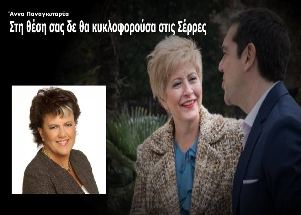 Ακούσαμε την κ. Κόλλια –Τσαρουχά, βουλευτή των ΑΝΕΛ, επικεφαλής του υπουργείου Μακεδονίας–Θράκης (…Μακεδονίας πρό συμφώνου Πρεσπών – ψηφίζοντας υπέρ Τσίπρα, να απαντά οργισμένη στην κ. Σοφία Βούλτεψη, της ΝΔ: “Δεν φοβάμαι να πάω στις Σέρρες. Εγώ θα ανεβώ στην εκλογική μου περιφέρεια”. Οι συνεργάτες της, σεμνά και ταπεινά, κατέβασαν την σκοπιανή σημαία της «Μακεδονίας“, με την οποία οι Σερραίοι “χαρακτήρισαν” το γραφείο της. Όμως να κυκλοφορήσει τώρα η κ. Κόλλια στις Σέρρες –όπου ανέβηκα εγώ – ειλικρινά, δεν θα της το συνιστούσα…