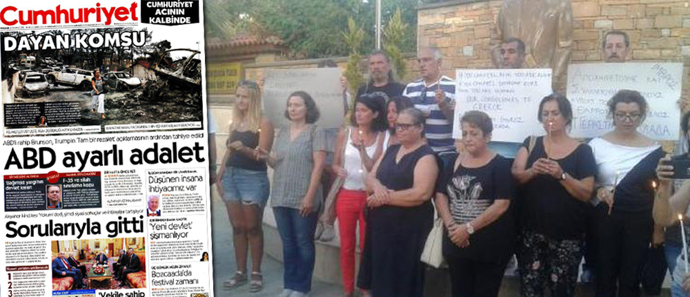 Έλληνες και Τούρκοι συγκεντρώθηκαν, το βράδυ της Τετάρτης, στον κήπο της κεντρικής εκκλησίας της χώρας της Ίμβρου και άναψαν ένα κερί στη μνήμη των ανθρώπων που κάηκαν στις φονικές πυρκαγιές της Αττικής.