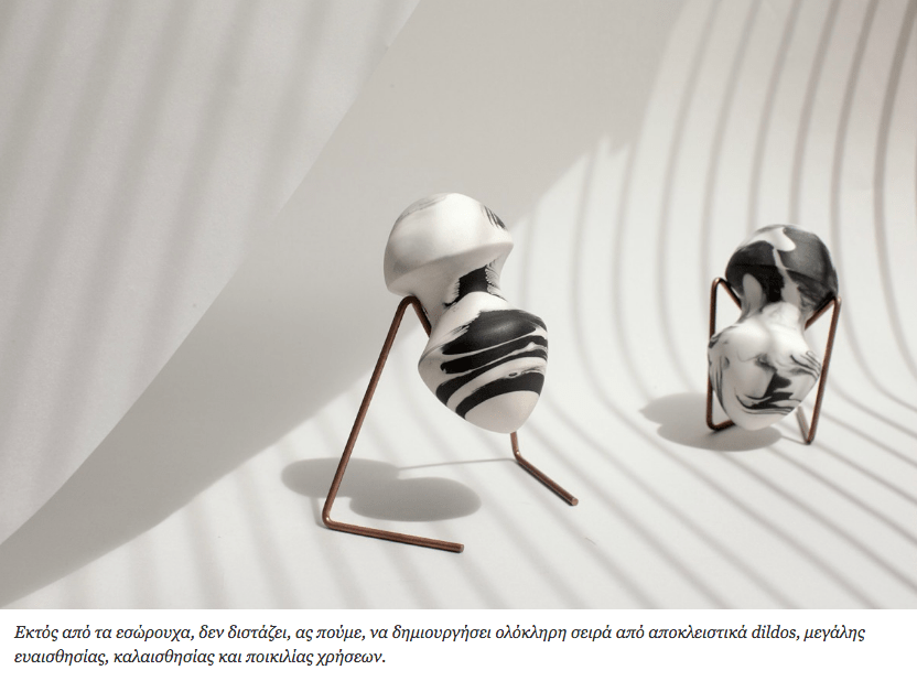 Εκτός από τα εσώρουχα, δεν διστάζει, ας πούμε, να δημιουργήσει ολόκληρη σειρά από αποκλειστικά dildos, μεγάλης ευαισθησίας, καλαισθησίας και ποικιλίας χρήσεων. Εδώ οφείλω να πω ότι ο πρώτος που διασκέδασε να φτιάχνει δονητές, ήδη από τα μέσα της δεκαετίας του ’90, ήταν ο Αχιλλέας Χρηστίδης, παίζοντας με τις διάφορες τάσεις της τέχνης. Ο δικός μου είναι σε ποπ στυλ και κοσμεί το σαλόνι μου.