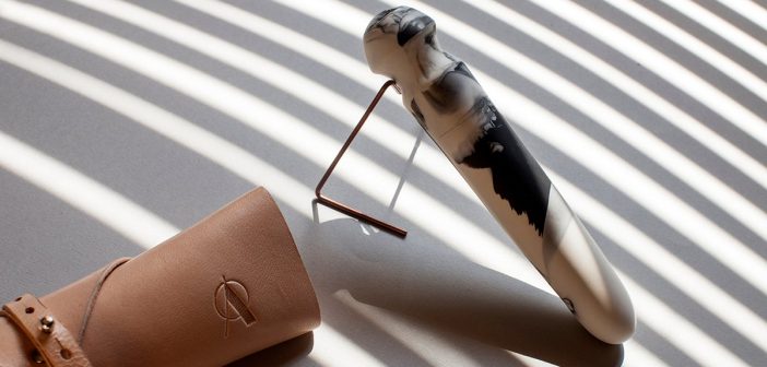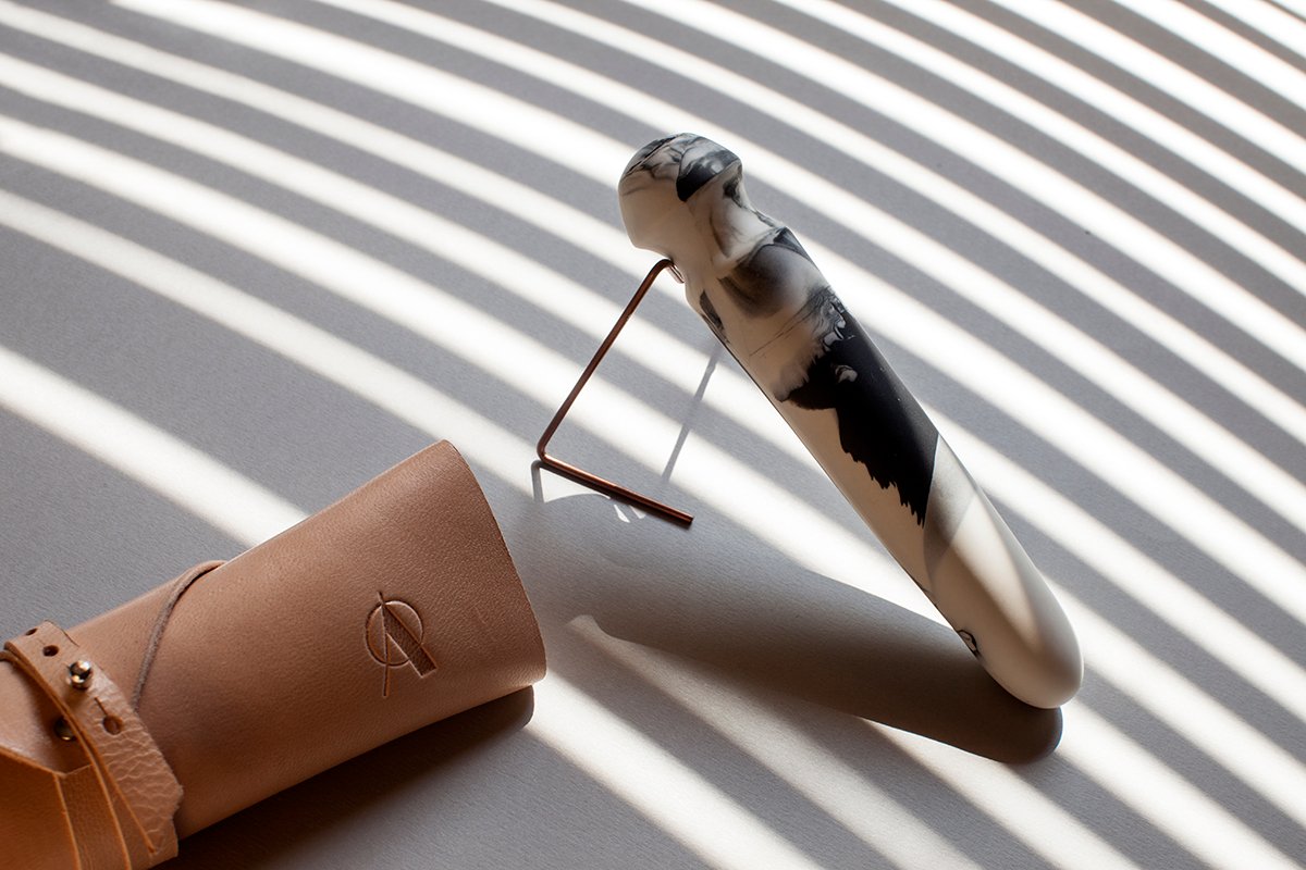 Κάθε κομμάτι είναι φτιαγμένο από λειασμένη πορσελάνη χυτεμένη με τη δική της τεχνική, θυμίζει αλάβαστρο, παρουσιασμένο μέσα σε μια μινιμαλιστική συσκευασία από αρνίσιο δέρμα δουλεμένο στο χέρι. Αποτέλεσμα; Ένα συναρπαστικό γραφιστικό σώμα, απολύτως μοναδικό, η επαφή του οποίου με το κορμί είναι εξαίσια. Η συλλογή μπορείς να πεις ότι γίνεται φορέας μιας οπτικής και αισθητηριακής αφήγησης που συντονίζεται με το ιδανικό της ολιστικής τέχνης. Ζωή και τέχνη ως όλον, θα έλεγε ένα κριτικός.