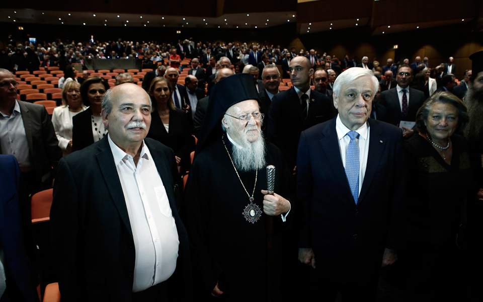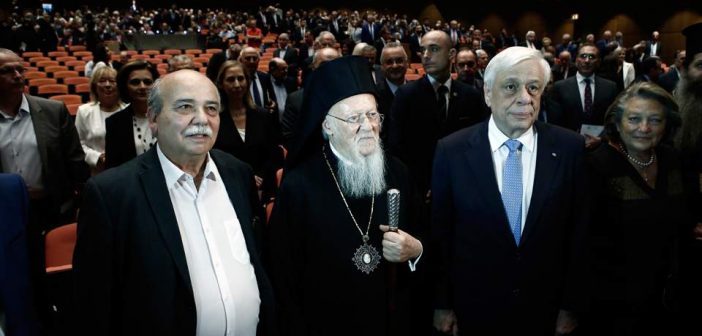 Παρουσία του Προέδρου της Δημοκρατίας, Προκόπη Παυλόπουλου, έλαβε χώρα το απόγευμα στην αίθουσα «Χρήστος Λαμπράκης» του Μεγάρου Μουσικής Αθηνών, η τελετή βράβευσης του Οικουμενικού Πατριάρχη Βαρθολομαίου από τη Βουλή των Ελλήνων και τον Σύλλογο Κωνσταντινουπολιτών, για την πολύπλευρη προσφορά του στην προστασία του περιβάλλοντος, ενώ παράλληλα ανακηρύχθηκε ισόβιος επίτιμος πρόεδρος του εν Αθήναις Συλλόγου Κωνσταντινουπολιτών. Στον χαιρετισμό που απηύθυνε ο Πρόεδρος της Ελληνικής Δημοκρατίας, Προκόπης Παυλόπουλος, μεταξύ άλλων, επεσήμανε: