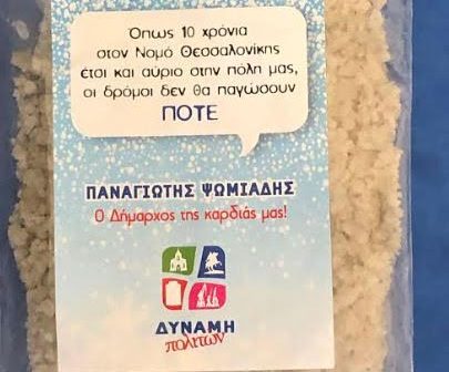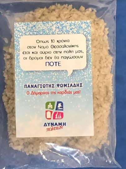 Χιλιάδες σακουλάκια με χοντρό αλάτι θα μοιράσει αύριο το πρωί Παρασκευή 4/1 σε κεντρικά σημεία του δήμου Θεσσαλονίκης ο συνδυασμός «Δύναμη Πολιτών» του Παναγιώτη Ψωμιάδη. «Πρόκειται για μια συμβολική κίνηση, καθώς όλοι θυμόμαστε τι έγινε με τον χιονιά του 2017 όταν η πόλη παρέλυσε. Όπως μάθαμε τότε από τον κ. Μπουτάρη, είχε παγώσει το αλάτι στις αλατιέρες…», σημείωσε ο κ. Ψωμιάδης.