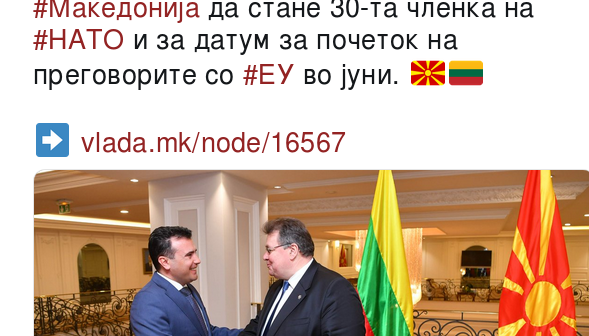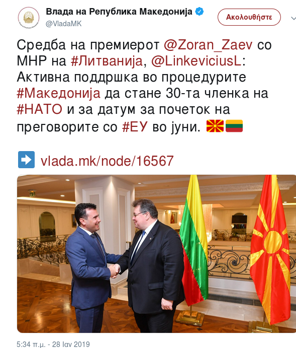 Στην τελευταία, αναφέρει χαρακτηριστικά ότι «δεν υπάρχουν διαφωνίες με τους γείτονες, ήρθε η ώρα για ευημερία. Ας φέρουμε την Ευρώπη στη ‘Μακεδονία’». Σε άλλη ανάρτηση, με αφορμή τη συνάντηση που είχε με τον υπουργό Εξωτερικών της Λιθουανίας σημειώνει ότι ο Λιθουανός ΥΠΕΞ «εξέφρασε την υποστήριξή του στην ένταξη της ‘Μακεδονίας’ σε ΕΕ και ΝΑΤΟ».