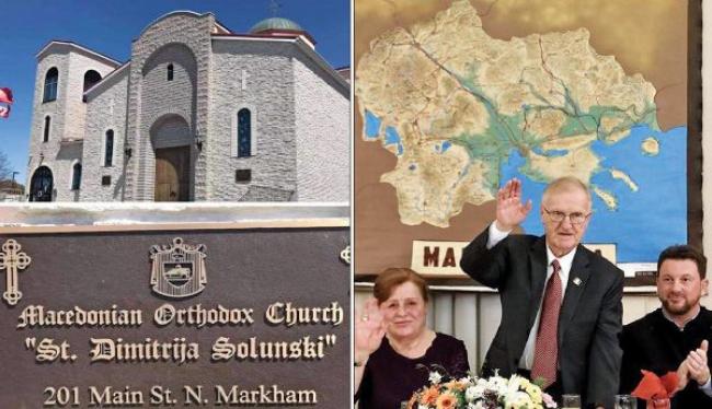 Σε μια μεγάλη αίθουσα που υπάρχει δίπλα από τη μητρόπολή τους στο Τορόντο, στον Αγιο Κλήμη Αχρίδας, ο σύλλογος των εκεί Σκοπιανών υπό την ονομασία «Ενωμένοι Μακεδόνες» (sic) γιόρτασε στις 2 Φεβρουαρίου τη «Νύχτα του Γκότσε Ντέλτσεφ». Ως γνωστόν, ο Γκότσε Ντέλτσεφ υπήρξε ένας από τους πρωταγωνιστές της Eξέγερσης του Ιλιντεν (1903), ο οποίος θεωρείται εθνικός ήρωας για τους Σκοπιανούς. Στην εκδήλωση αυτή, λοιπόν, δέσποζε άλλη μια φορά -κρεμασμένος στον τοίχο- ένας τεράστιος χάρτης στον οποίο οι Σκοπιανοί εμφανίζουν όλη τη Μακεδονία μας, από τη Φλώρινα έως την Κατερίνη και από το Κιλκίς έως και την Καβάλα, ως έδαφος ανήκον στο δικό τους κράτος! Η ιστορική πλαστογραφία δεν περιοριζόταν σε αυτό το γεγονός, αφού μια τεράστια σημαία με τον δωδεκάκτινο Ηλιο της Βεργίνας βρισκόταν πάνω από το βήμα των ομιλητών.«Είχαμε κάνει πολλές ενέργειες τα προηγούμενα χρόνια προκειμένου να διαμαρτυρηθούμε στους πρέσβεις και τους προξένους των Σκοπίων για τις ενέργειες αυτές» αναφέρει αποκλειστικά στην «Ορθόδοξη Αλήθεια» ο Χρήστος Καράτζιος, πρόεδρος της Παμμακεδονικής Ενωσης Καναδά, και συνεχίζει: «Με τον πιο ξεδιάντροπο τρόπο αναρτούν στο facebook και σε ιστοτόπους ανακοινώσεις σχετικά με τις εκδηλώσεις τους, προωθώντας μια επεκτατική προπαγάνδα αλυτρωτισμού».
