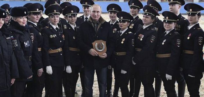Ο Ρώσος πρόεδρος Βλαντίμιρ Πούτιν, εμφανίσθηκε σήμερα, Πέμπτη, παραμονές της Παγκόσμιας Ημέρας της Γυναίκας να κάνει ιππασία με γυναίκες αστυνομικούς που ανήκουν στο σύνταγμα ιππικού της ρωσικής αστυνομίας. Ο Ρώσος πρόεδρος, φορώντας τζιν και μπουφάν, βρέθηκε σε μια έκθεση που είχε ως θέμα την ιστορία του συντάγματος ιππικού της ρωσικής αστυνομίας, στην οποία εκτίθενται παλαιού και νεότερου τύπου οπλισμοί των αστυνομικών που υπηρετούν στην μονάδα αυτή.