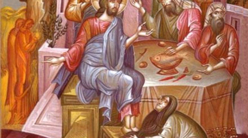 Δύο μέρες πριν το Πάσχα, καθώς ο Κύριος ανέβαινε προς τα Ιεροσόλυμα, κι ενώ βρισκόταν στο σπίτι στου λεπρού Σίμωνα, τον πλησίασε μια πόρνη γυναίκα κι άλειψε το κεφάλι Του με πολύτιμο μύρο. Η τιμή του ήταν γύρω στα τριακόσια δηνάρια, πολύτιμο άρωμα και γι’ αυτό οι μαθητές την επέκριναν και περισσότερο απ’ όλους ο Ιούδας.