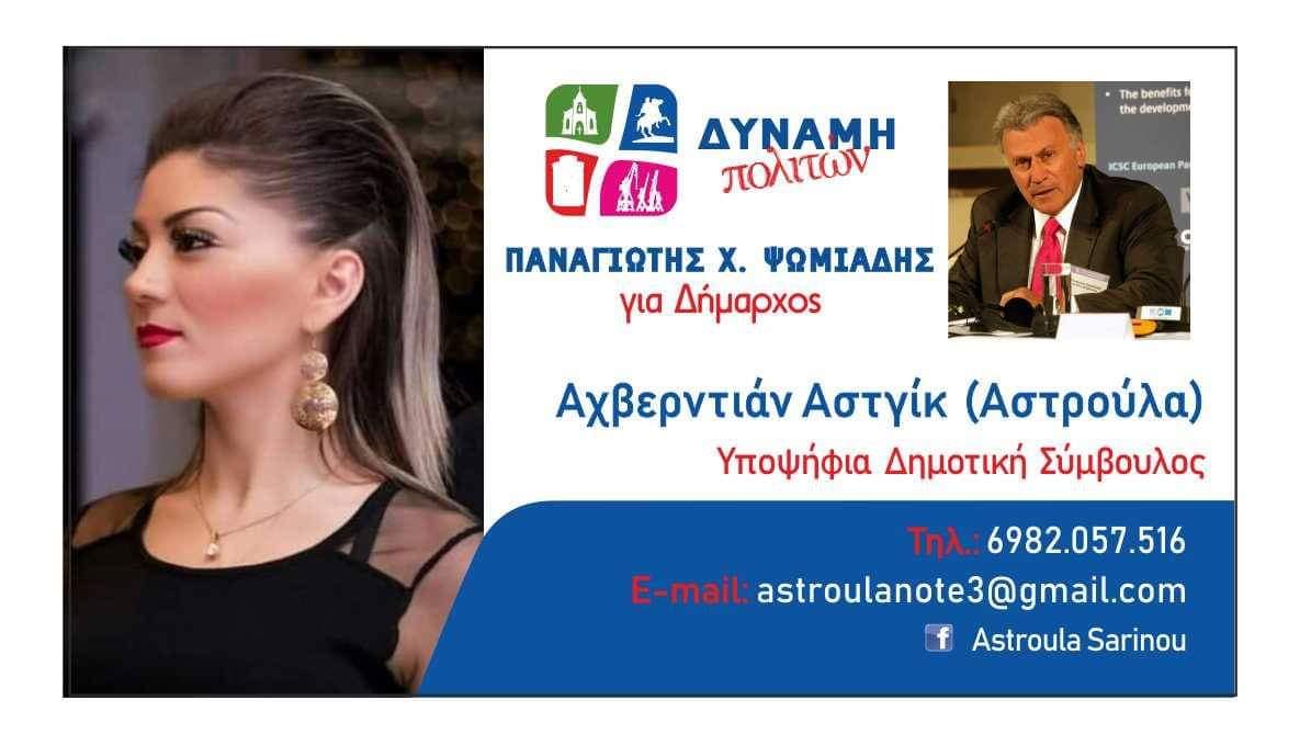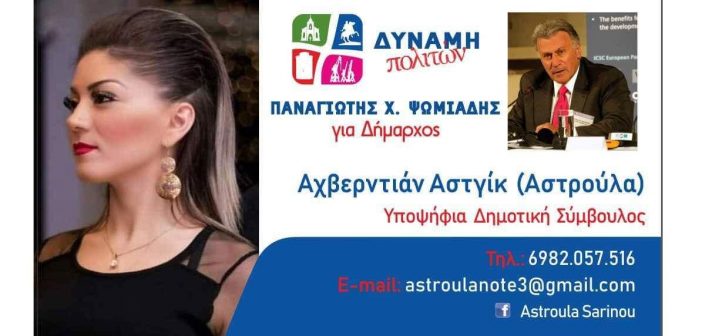 Η υποψήφια δημοτικός σύμβουλος Αστγίκ (Αστρούλα) Αχβερντιάν με τον συνδιασμό “Δύναμη Πολιτων” έδωσε τις ευχές της για το Άγιο Πάσχα: “Το χαρμόσυνο μήνυμα της Αναστάσεως ας φωτίσει τις καρδιές μας. Εύχομαι ολόψυχα Καλή Ανάσταση και Καλό Πάσχα σε όλο τον κόσμο. Το Ανέσπερο της Αναστάσεως Φώς να φωτίσει το δρόμο μας, να ζεστάνει τις καρδιές μας, να εξαγνίσει τις ψυχές μας. Να μας βοηθήσει να δούμε πιο καθαρά, δίπλα μας. Αγάπη, Ειρήνη, Δικαιοσύνη σε όλο τον κόσμο!!!
