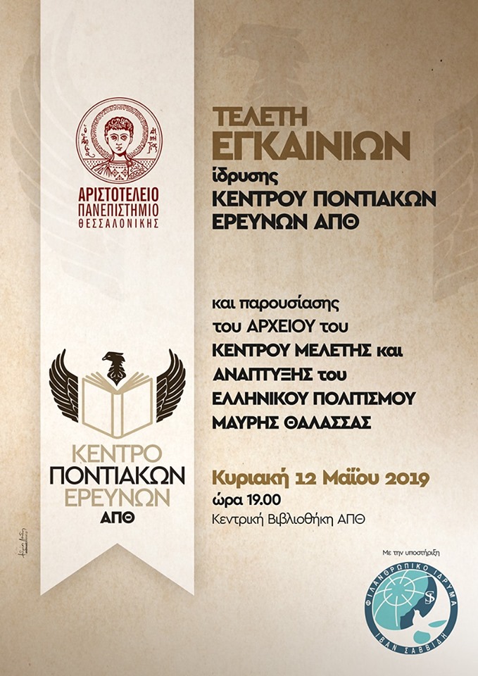 Με τη λήξη του Διεθνούς Επιστημονικού Συνεδρίου «Η Γενοκτονία των χριστιανικών πληθυσμών της Οθωμανικής Αυτοκρατορίας και οι συνέπειές της (1908-1923)», που θα πραγματοποιηθεί από την Παρασκευή 10 έως και τη Δευτέρα 12 Μαΐου 2019, στην Αίθουσα Τελετών «Αλέξανδρος Παπαναστασίου» της Παλαιάς Φιλοσοφικής Σχολής, θα πραγματοποιηθεί η Τελετή Εγκαινίων του Αρχείου του Κέντρου Μελέτης και Ανάπτυξης του Ελληνικού Πολιτισμού Μαύρης Θάλασσας & του Κέντρου Ποντιακών Ερευνών. Η εκδήλωση θα λάβει χώρα την Κυριακή 12 Μαΐου 2019 και ώρα 19:00, στο Επιστημονικό Αναγνωστήριο της Κεντρικής Βιβλιοθήκης του ΑΠΘ.