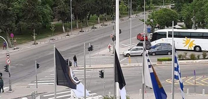 Το πρωί της Δευτέρας (13/5) οι υπάλληλοι του δήμου, με την άδεια του δημάρχου Γιάννη Μπουτάρη, προχώρησαν στην έπαρση των δυο σημαιών, που κυματίζουν δίπλα στην ελληνική σημαία αλλά και αυτή του Δήμου.