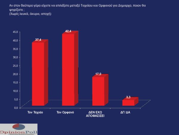 Ανατροπή στο “γαλάζιο” σκηνικό της β’ Κυριακής προβλέπει νέα δημοσκόπηση για το δήμο Θεσσαλονίκης. Σύμφωνα με την δημοσκόπηση της Opinion Poll, ο Νίκος Ταχιάος συγκεντρώνει ποσοστό 19,1%, ο Γιώργος Ορφανός 17,7%, ο Κωνσταντίνος Ζέρβας 13,4%, η Κατερίνα Νοτοπούλου 13,1% και ο Σπύρος Βούγιας 8,9%. Ωστόσο, στην β’ Κυριακή, ο Γιώργος Ορφανός φέρεται να κερδίζει το δήμο Θεσσαλονίκης, καθώς συγκεντρώνει ποσοστό 42,2% έναντι 37,4% του Νίκου Ταχιάου. Να σημειωθεί ότι το ποσοστό των αναποφάσιστων στην α’ Κυριακή είναι 5,6% ενώ στην β’ Κυριακή φτάνει το 17%.