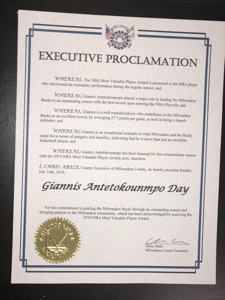 Για το Μιλγουόκι η 14η Ιουλίου είναι πλέον επίσημα «Giannis Antetokounmpo Day» (Ημέρα Γιάννη Αντετοκούνμπο), προς τιμήν του Ελληνα παίκτη, όπως έκανε γνωστό ο αξιωματούχος της κομητείας, Chris Abele.