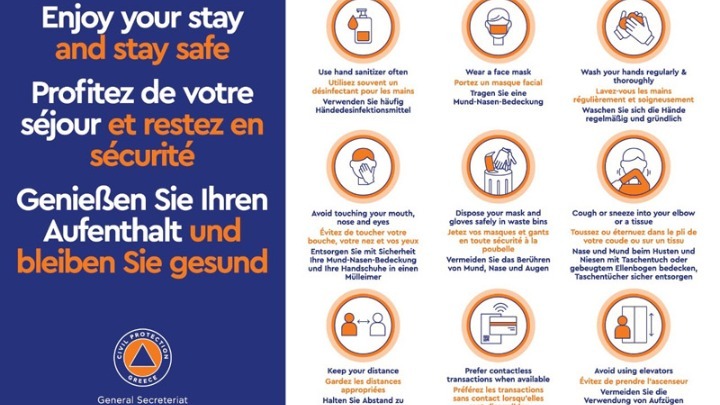 Με κεντρικό μήνυμα “Απολαύστε τη διαμονή σας – Μείνετε ασφαλής «Enjoy your stay and stay safe», η Γενική Γραμματεία Πολιτικής Προστασίας (ΓΓΠΠ) προχώρησε στην έκδοση εννέα οδηγιών για τη λήψη των απαραίτητων μέτρων προστασίας από τον κορονοϊό, με δεδομένο ότι από την 1η Ιουλίου “ανοίγουν” 41 πύλες εισόδου στην Ελλάδα και ειδικότερα 27 αεροδρόμια, 7 χερσαία σημεία εισόδου και 7 λιμάνια.