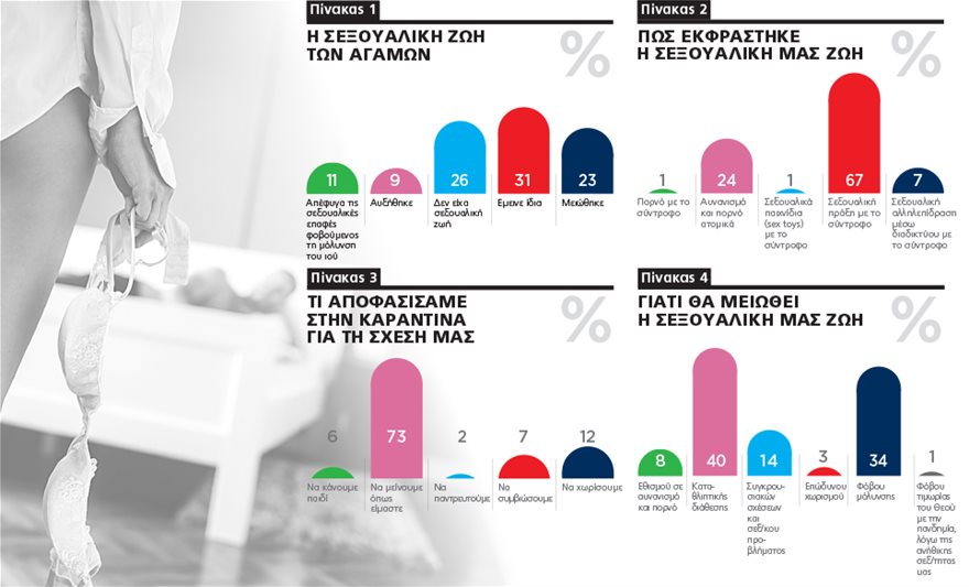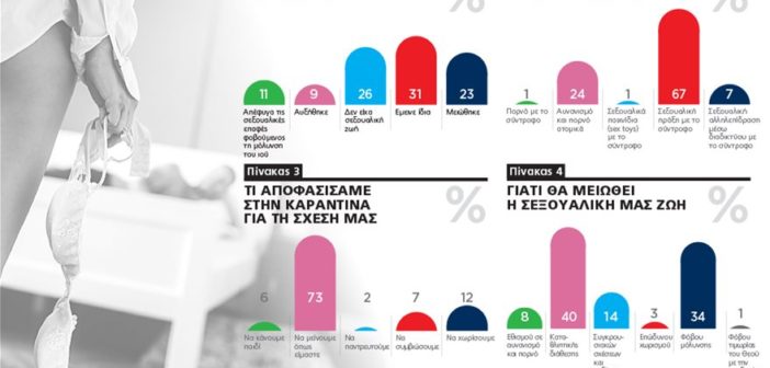 Επτά στους 10 εξέφρασαν την άποψη ότι η σεξουαλική ζωή θα μειωθεί λόγω της πανδημίας, είτε λόγω της καταθλιπτικής διάθεσης που προκαλεί (40%), είτε λόγω του φόβου μόλυνσης (34%).