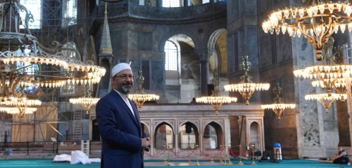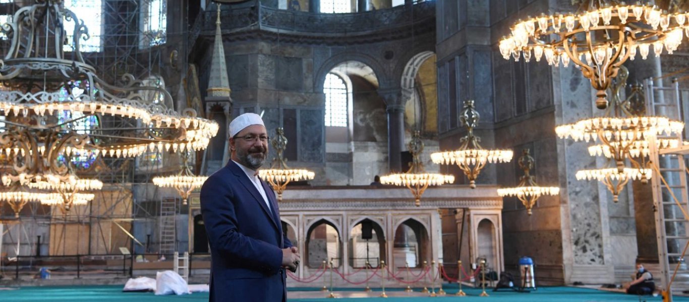 Ο Τούρκος πρόεδρος φόρεσε, μάλιστα, μέχρι και το καπέλο προσευχής, διαβάζοντας για λίγα λεπτά απόσπασμα από το Κοράνι. Στην είσοδο της Αγίας Σοφίας τοποθετήθηκε μία πινακίδα, η οποία αναγράφει πλέον «Μεγάλο Τζαμί», ενώ σε περίοπτη θέση βρίσκεται αναρτημένη και η τουρκική σημαία.