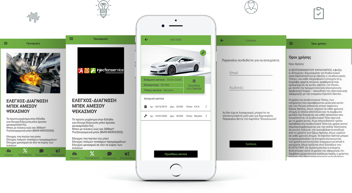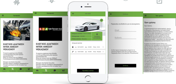 Η εφαρμογή Injection Service είναι μια πρωτοποριακή εφαρμογή για τα δεδομένα των συνεργείων της χώρας. Αντικαθιστά το κλασικό βιβλίο συντήρησης του οχήματος με ηλεκτρονικό. Κάθε εργασία που πραγματοποιείται καταχωρείται είτε από εμάς είτε από τον πελάτη. Να σημειωθεί πως η πρώτη καταχώρηση γίνεται υποχρεωτικά απ το συνεργείο μας. Αποστέλλονται ειδοποιήσεις των προγραμματισμένων μελλοντικών εργασιών όπως επίσης και ειδοποιήσεις πιθανών προσφορών για κάποιες περιόδους. Υποστηρίζει ένα και πλέον οχήματα ανά χρήστη. Είναι ένα εργαλείο οργάνωσης του αρχείου συντήρησης τους οχήματος.