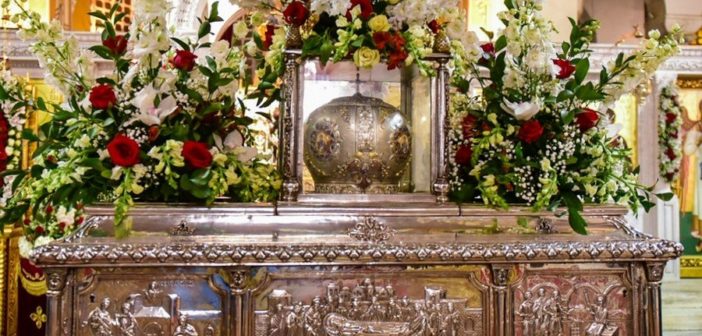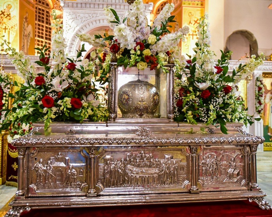 Από μία επιγραφή του 1284 μ.Χ. πάνω σε λευκόμάρμαρο, η oποία βρέθηκε στη Θεσσαλονίκη δίπλα στην πύλη του τζαμιού Εσκί Σεράι (ναός του Προφήτη Ηλία) που δημοσιεύθηκε από τους Ευθ. Τσιγαρίδα Κάτια Λοβέρδου-Τσιγαρίδα και σήμερα βρίσκεται στο Ναό του Αγίου Γεωργίου (Ροτόντα), πληροφορούμαστε ότι ο ανακαινιζόμενος ναός του τρισμάκαρος «έχει εντός τον μέγα μυροβλύτη».