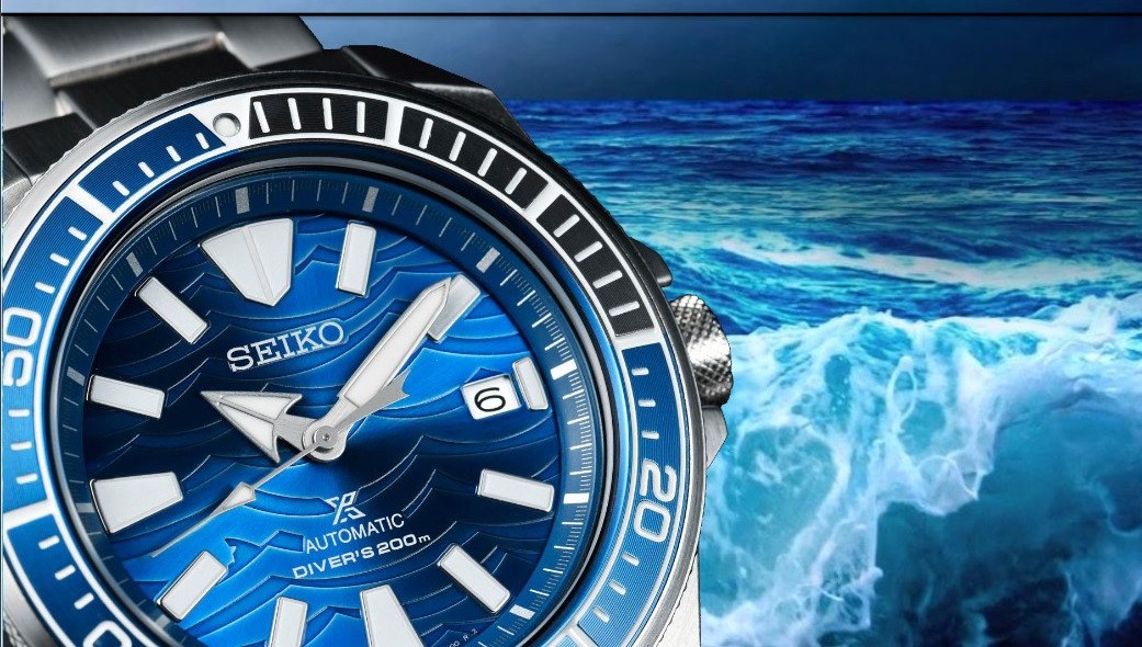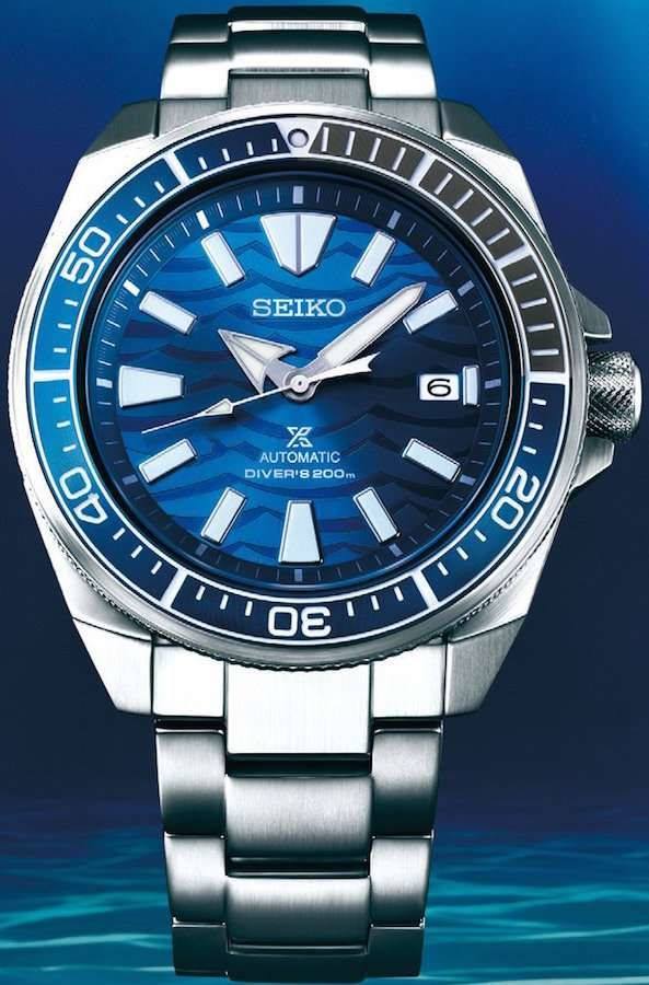 Η SEIKO αυτός ο Ιαπωνικός γίγαντας, που εμαθε στον κόσμο τα quartz ωρολόγια παρουσίασε το Tiburon Blanco ένα νέο αυτόματο ωρολόι. Το Seiko Prospex – Samurai. SAVE THE OCEAN. Πρόκειται για ένα σπουδαίο ρολόι μηχανικό αυτόματο με αυτονομία 41 ωρών. Εχει διάμετρο 43,8 και είναι κατάλληλο για καταδύσεις εως 200 μέτρα στον βυθό της θάλασσας. Η κάσσα του είναι μπλέ χρώματος με ασημί μπρασελέ.