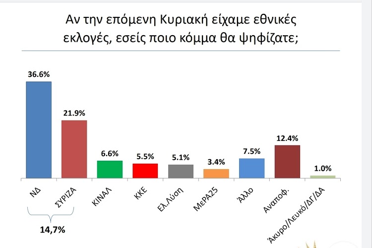 Σύμφωνα με την αξιολόγηση των πολιτών και την καταγραφή των απόψεών τους η μεγάλη πλειοψηφία του 36,6 % εξακολουθεί να εμπιστεύεται την Κυβέρνηση Μητσοτάκη και θα την ψήφιζε εάν την ερχόμενη Κυριακή είχαμε εκλογές. Με διαφορά 14,7% από τη ΝΔ, τον ΣΥΡΙΖΑ εμπιστεύεται το 21,9%. Τρίτο στη σειρά παραμένει σταθερά το ΚΙΝΑΛ με ποσοστό 6,6%, ακολουθεί το ΚΚΕ με 5,5%, η Ελληνική Λύση με 5,1% και το ΜεΡΑ25 3,4%
