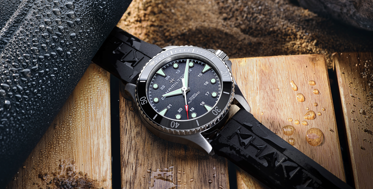 Η σειρά Khaki Navy Scuba αντλεί έμπνευση από τον υδάτινο κόσμο και περνά στο επόμενο επίπεδο, με ακόμη καλύτερη λειτουργία μέσα και έξω. Με αυξημένο το μέγεθος της κάσας του στα 43mm, αυτό το δυναμικό ρολόι είναι αδιάβροχο στα 30 bar (300 m) και δένει με ασφάλεια είτε με μαύρο λουράκι από καουτσούκ είτε με ατσάλινο μπρασελέ. Ο χρωματιστός δακτύλιος στη στεφάνη, διατίθεται σε μαύρο ή μπλε για να ταιριάζει με το καντράν και είναι κατασκευασμένος από κεραμικό, ένα από τα πιο υψηλής τεχνολογίας υλικά.
