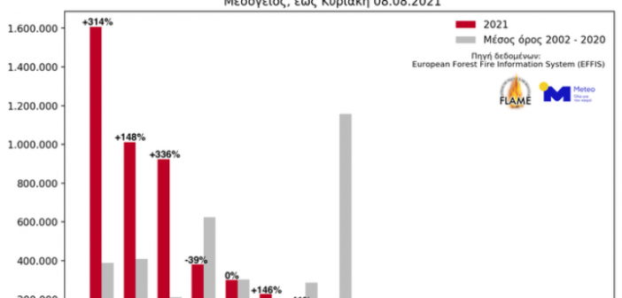 Η Ελλάδα κατατάσσεται τρίτη στη Μεσόγειο – μετά από την Τουρκία και την Ιταλία – σε ό,τι αφορά την καμένη έκταση φέτος (συνολικά 933.680 στρέμματα έως 8 Αυγούστου 2021) και δεύτερη – μετά την Κύπρο – όσον αφορά την αύξηση (+336%) των καμένων εκτάσεων συγκριτικά με τον μέσο όρο της περιόδου 2002 – 2020, σύμφωνα με το meteo του Αστεροσκοπείου.