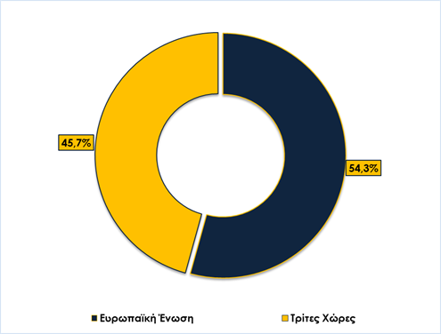 Σημαντική αύξηση εξαγωγών κατέγραψαν όλοι οι κλάδοι στο α’ επτάμηνο του 2022 συγκριτικά με πέρυσι και συγκεκριμένα: τα βιομηχανικά κατά € 1.408,9 εκατ., δηλαδή 40,8%, τα τρόφιμα κατά € 644,6 εκατ., δηλαδή 18,9%, τα χημικά κατά € 197,1 εκατ., δηλαδή 5,7%, τα μηχανήματα και οχήματα κατά € 559,5 εκατ., δηλαδή 25,7%, τα διάφορα βιομηχανικά προϊόντα κατά € 446,5 εκατ., δηλαδή 28,3%, οι πρώτες ύλες κατά € 100,5 εκατ., δηλαδή 10,1%, τα ποτά και καπνά κατά € 64,7 εκατ., δηλαδή 11,5%, τα λίπη και έλαια κατά € 41,6 εκατ., δηλαδή 9,2% και τα μη ταξινομημένα προϊόντα κατά € 133,5 εκατ., δηλαδή 45,9%. Αναφορικά με τους σημαντικότερους εξαγωγικούς προορισμούς, τα κράτη-μέλη της Ε.Ε. (27) απορρόφησαν το 54,3% των ελληνικών εξαγωγών, ήτοι € 16.817,4 εκατ., ενώ οι Τρίτες Χώρες το 45,7%, ήτοι € 14.159,8 εκατ. Χωρίς τα πετρελαιοειδή, στην Ε.Ε. (27) απεστάλη το 66,0% και στις Τρίτες Χώρες το 34,0%, ποσοστά τα οποία αντιστοιχούν σε € 13.385,5 εκατ. και € 6.882,2 εκατ. αντίστοιχα.
