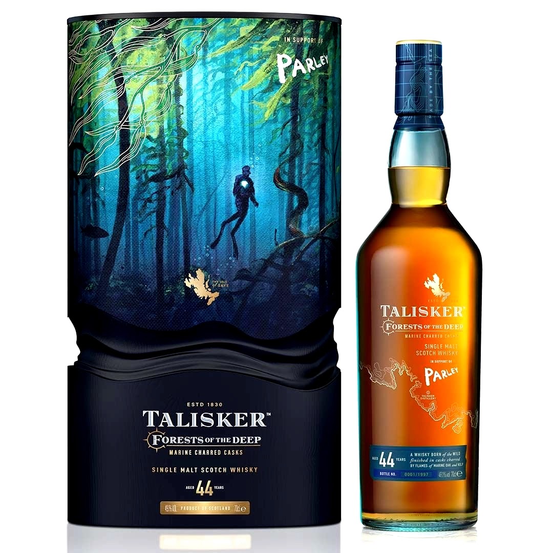 Το Talisker 44-Year-Old: Forests of the Deep Single Malt Scotch Whisky είναι το παλαιότερο ουίσκι που έχει βγει ποτέ από αυτό το αποστακτήριο στο νησί του Skye στη Σκωτία, ευρέως γνωστό για την παραγωγή ουίσκι με τύρφη που είναι καπνιστό, μεν, αλλά δεν είναι κοντά στα επίπεδα των ομολόγων του lslay. Η έμπνευση πίσω από αυτό το εξαιρετικά limited edition απόσταγμα ήταν ένα ταξίδι με επικεφαλής την ομάδα προστασίας και διατήρησης της θαλάσσιας ζωής, Parley for the Oceans, και συνεργάτη του Talisker, σε δάση φυκιών κοντά στο Ακρωτήριο της Καλής Ελπίδας. Σε αυτό το θαλάσσιο ταξίδι χρησιμοποιήθηκαν δούγες από βαρέλια για να απορροφήσουν τον θαλασσινό αέρα και την άλμη. Πίσω στη στεριά, οι ράβδοι συναρμολογήθηκαν σε βαρέλια που καπνίστηκαν χρησιμοποιώντας σκωτσέζικα θαλάσσια φύκια βιώσιμης καλλιέργειας και ρινίσματα ξύλου, προφανώς για να προστεθεί λίγη φυτική γεύση ωκεανού στο ξύλο.