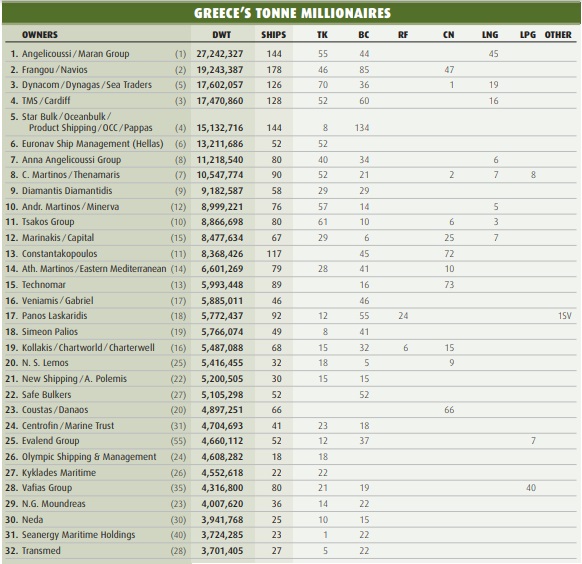 Δύο γυναίκες της ελληνικής ναυτιλίας διατηρούν για ακόμη ένα έτος, τα «πρωτεία», τόσο σε χωρητικότητα όσο και σε αριθμό πλοίων, ενώ οι «εκατομμυριούχοι» Έλληνες εφοπλιστές σε χωρητικότητα dwt, αυξήθηκαν από 76 σε 78, σύμφωνα με την ετήσια ανάλυση – επισκόπηση των στοιχείων από την περιοδική έκδοση της Naftiliakis – Newsfront.
