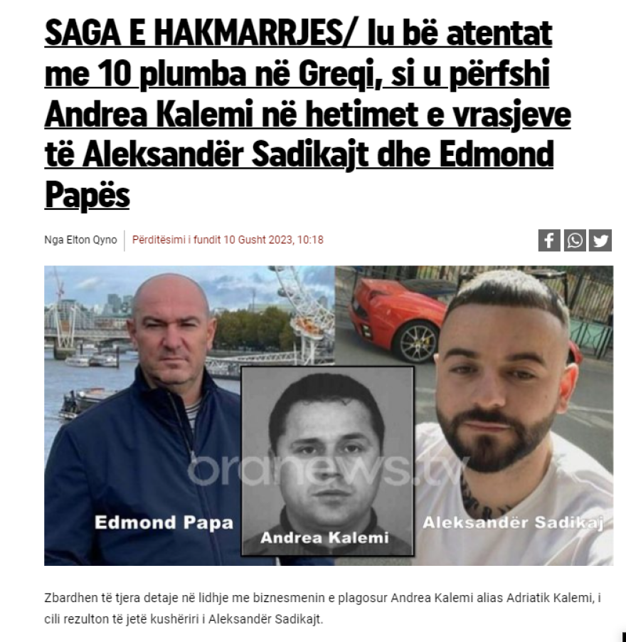 Ο Αντρέα Καλέμι, σύμφωνα με ΜΜΕ της Αλβανίας θεωρείται ύποπτος για εμπλοκή στη δολοφονία του Έντμοντ Πάπα, ο οποίος σκοτώθηκε τον Δεκέμβριο στην περιοχή Σελίτα των Τιράνων. Επίσης, έχει κατηγορηθεί για τη δολοφονία δύο ανθρώπων στο Βέλγιο το 2001. Σύμφωνα με τα στοιχεία που δόθηκαν στο τοπικό Top Channel, ο Καλέμι εισήλθε στην Ελλάδα στις 5 Αυγούστου από την Κακαβιά, μαζί με τη σύζυγο και τα τρία παιδιά του. Πίσω από τη δολοφονία του Έντμοντ Πάπα και κατ” επέκταση τους πυροβολισμούς του Αντρέα Καλέμι φέρεται να βρίσκεται ένα μεγάλο κουβάρι υποθέσεων στο οποίο εμπλέκεται η αλβανική μαφία και στο επίκεντρο βρίσκεται το εμπόριο ναρκωτικών. Η δολοφονία του Πάπα -για την οποία κατηγορείται ο Καλέμι- ήρθε ως απάντηση στην εξάρθρωση συμμορίας «αντιπάλου» του κατά τη διάρκεια του φετινού καλοκαιριού στα Τίρανα.