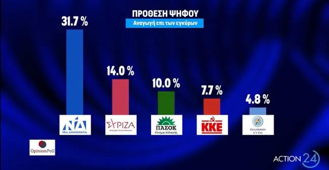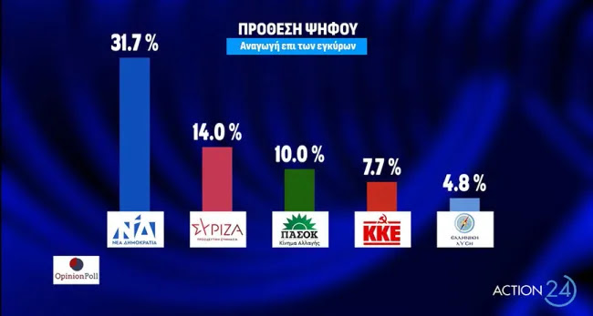Στην πρόθεση ψήφου (με αναγωγή επί των εγκύρων) η ΝΔ συγκεντρώνει το 31,7%, ο ΣΥΡΙΖΑ 14%, το ΠΑΣΟΚ 10%, το ΚΚΕ 7,7%, η Ελληνική Λύση 4,8%, οι Σπαρτιάτες 2,9%, η Πλεύση Ελευθερίας 2,8%, η Νίκη 3,7%, ενώ οι αναποφάσιστοι έφτασαν στο 15%. Στην εκτίμηση ψήφου, η Νέα Δημοκρατία συγκεντρώνει ποσοστό 39,1%, ο ΣΥΡΙΖΑ 17,3%, το ΠΑΣΟΚ 12,3%, το ΚΚΕ 8,7%, η Ελληνική Λύση 4,0%, οι Σπαρτιάτες 3,6%, η Πλεύση Ελευθερίας 3,4% και η Νίκη 4,6%.