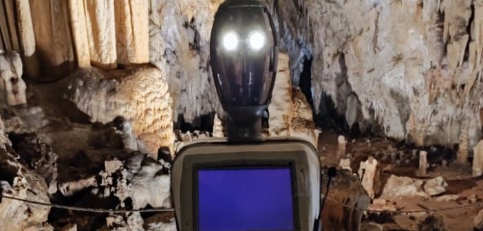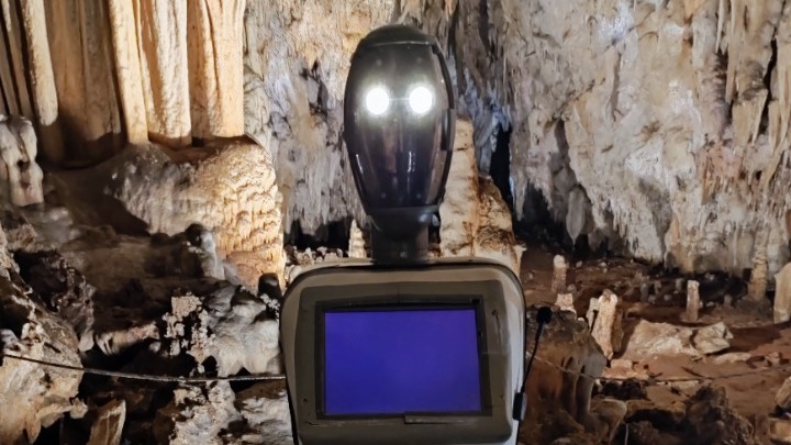 Το ρομπότ εξελιγμένης τεχνολογίας, που ξεναγεί από πέρυσι τον Ιούλιο τους επισκέπτες του σπηλαίου από την είσοδο έως και τα 100 πρώτα μέτρα εντός αυτού, κατασκευάστηκε εξ ολοκλήρου (το λογισμικό) στο Ίδρυμα Τεχνολογίας και Έρευνας (ΙΤΕ) και έχει τη δυνατότητα να απαντά σε περισσότερες από 30 προκαθορισμένες ερωτήσεις.
